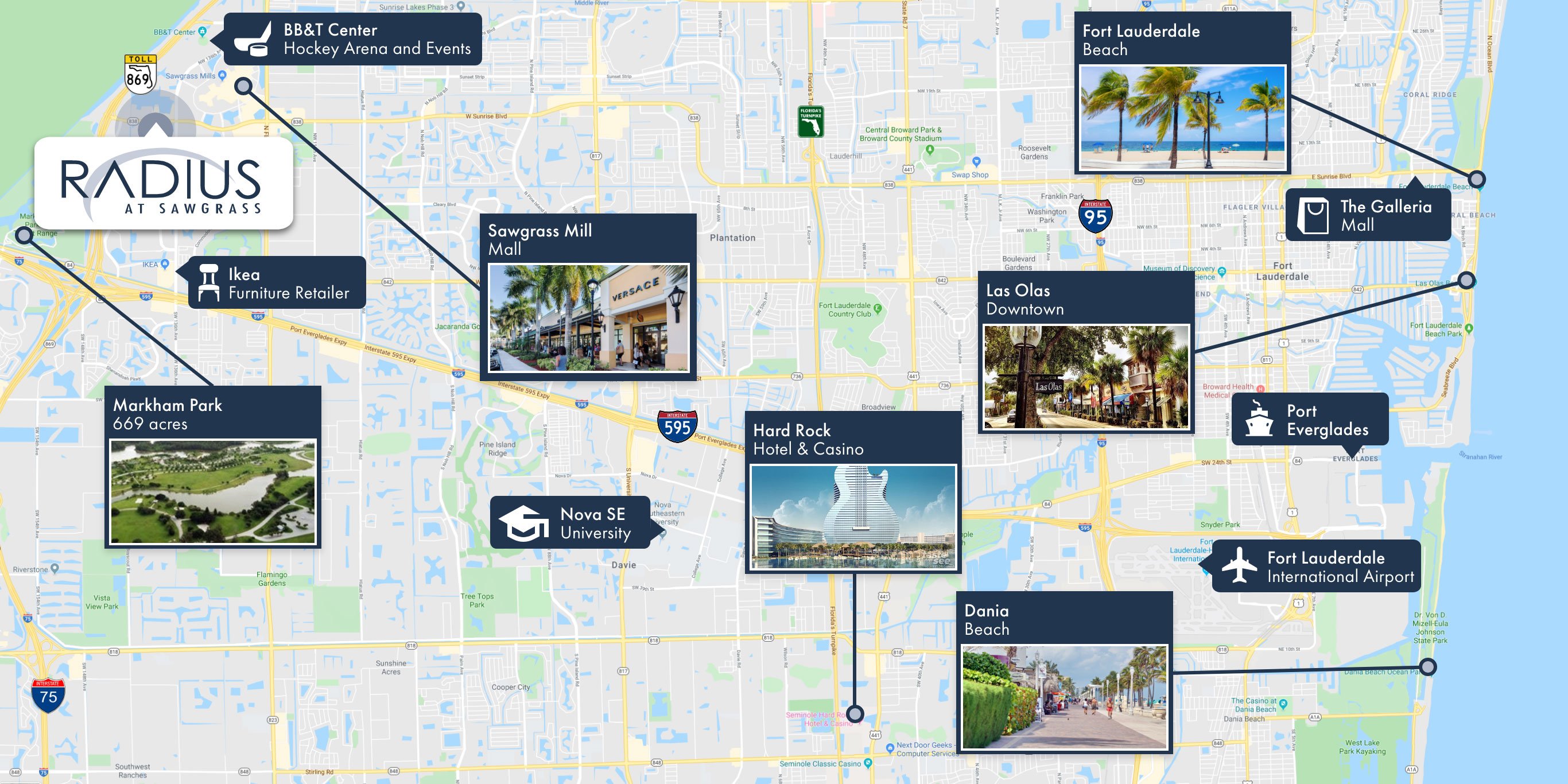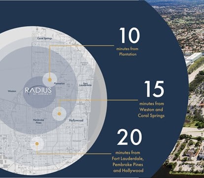 Radius’ unique location boasts direct access to I-75, via Sunrise Boulevard; I-595 via 136th Street; and Florida’s Turnpike and I-95 via 595.
